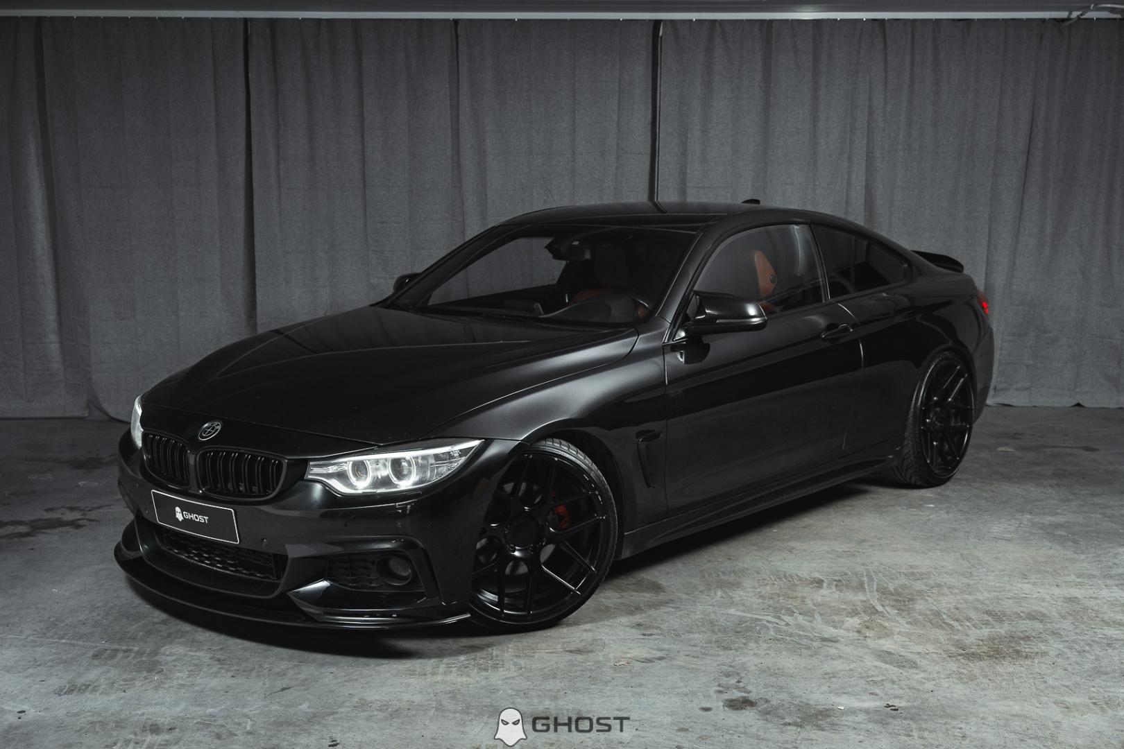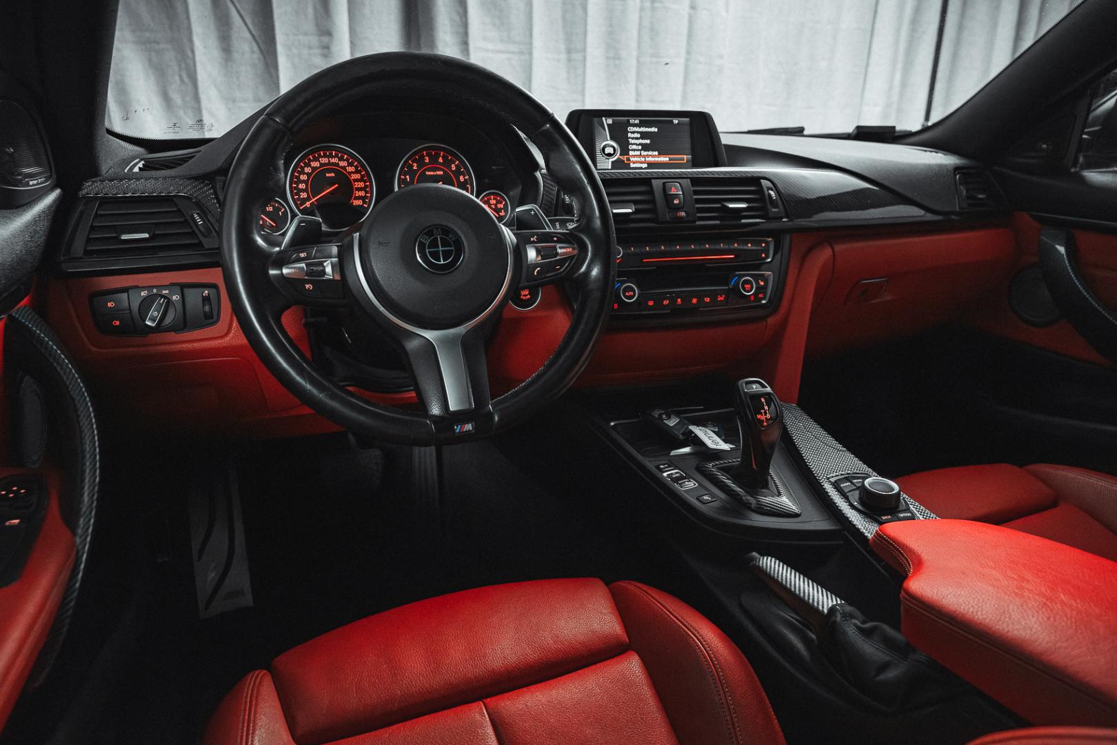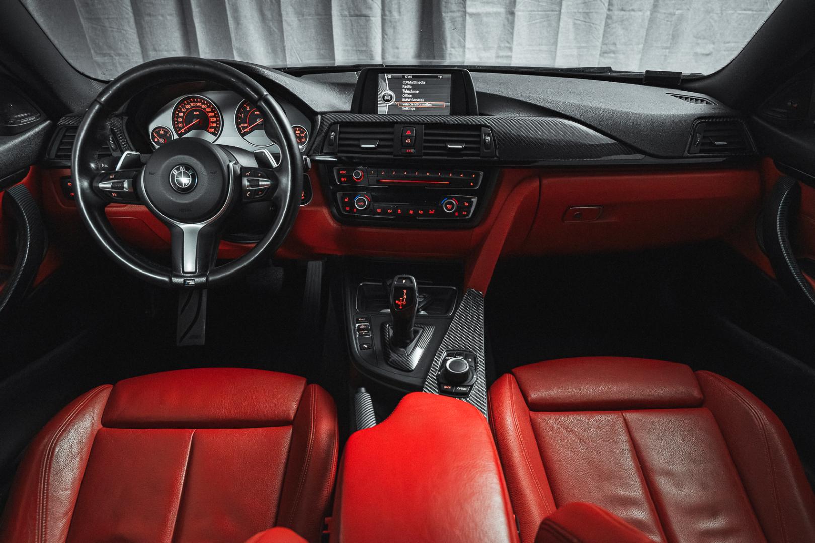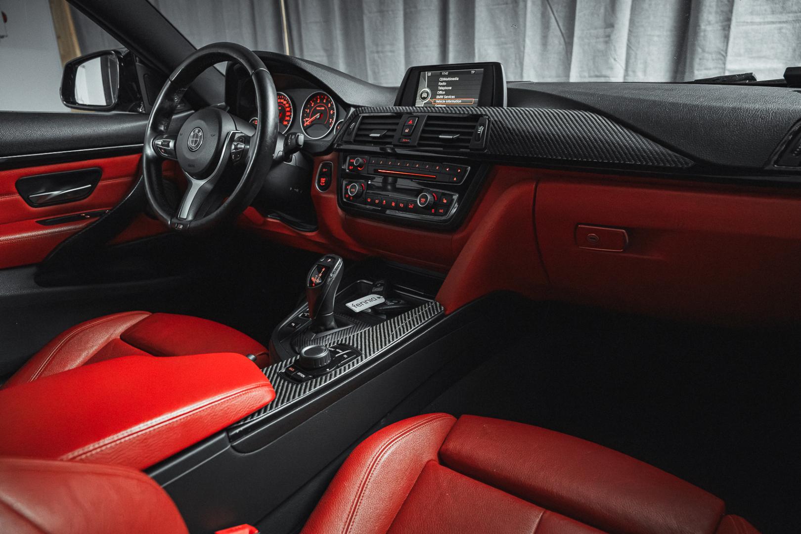 Räyheä BMW 428i F32 Coupe mustalla metallivärillä ja erikoisella punaisella nahkasisustalla sekä hiilikuituisilla yksityiskohdilla. Tästä ei kyllä auto komeammaksi muutu. QT Performancen softan ja downpipen ansiosta auto ei pelkästään näytä hyvältä vaan myös kuulostaa hyvältä!