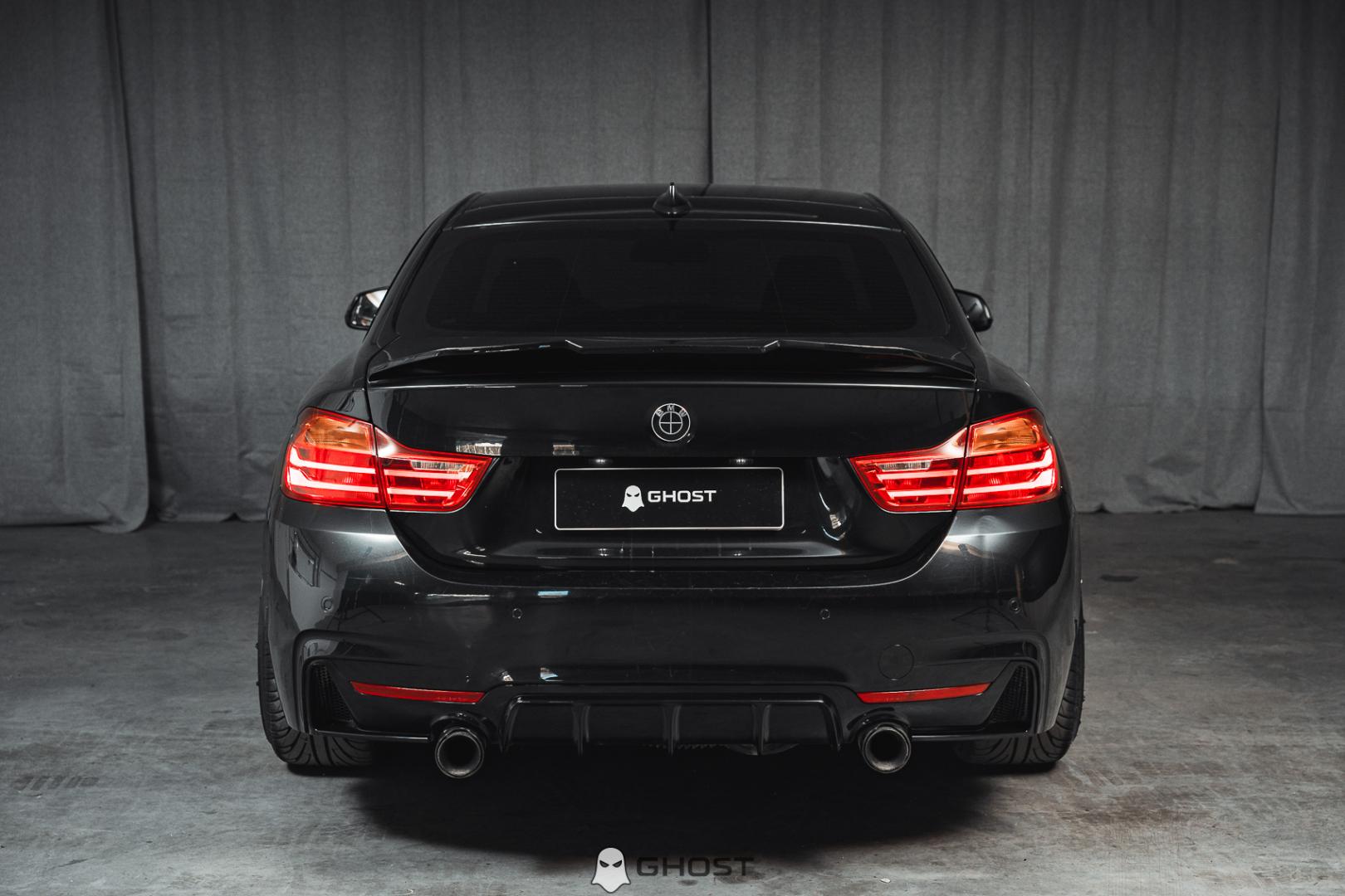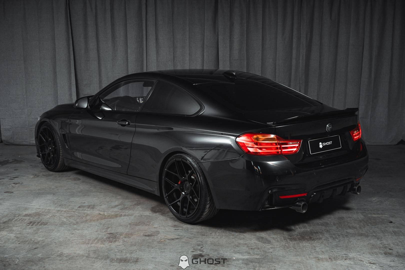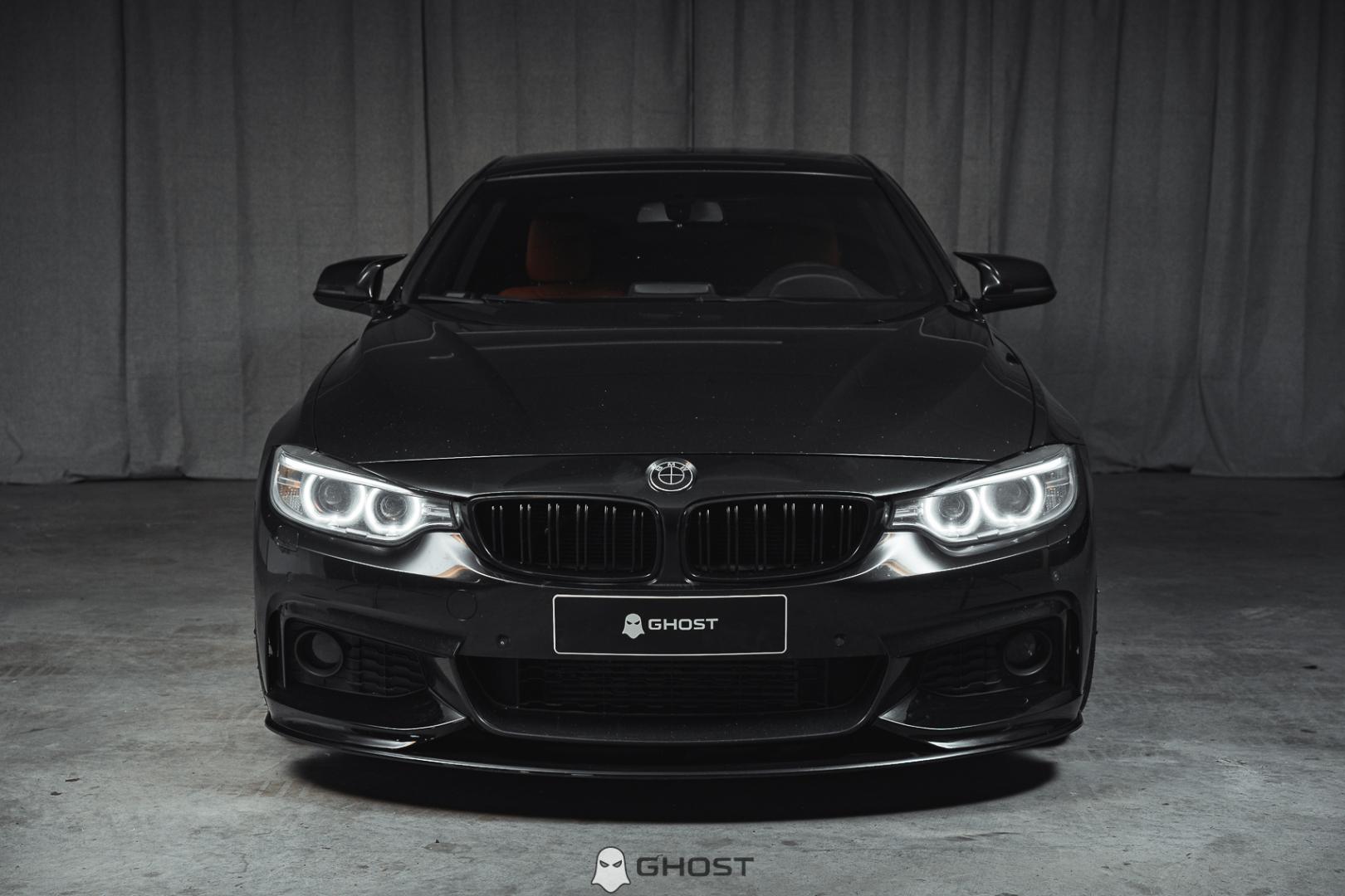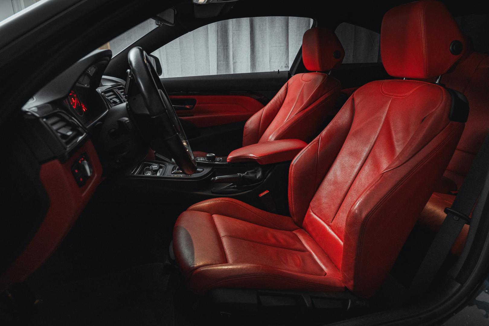 Räyheä BMW 428i F32 Coupe mustalla metallivärillä ja erikoisella punaisella nahkasisustalla sekä hiilikuituisilla yksityiskohdilla. Tästä ei kyllä auto komeammaksi muutu. QT Performancen softan ja downpipen ansiosta auto ei pelkästään näytä hyvältä vaan myös kuulostaa hyvältä!